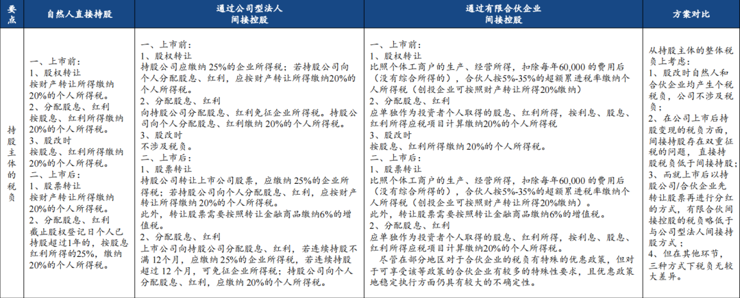 拟上市主体的股权架构设置——直接持股还是间接持股? 实际控制人可以通过自然人直接持股、通过公司型法人间接控股、通过有限合伙企业间接控股等多种股权架构实现对拟上市主体的控制。三种持股方案在持股主体的税负、资本运作的便利程度、上市退出机制、运营及管理成本等方面各有利弊,对以上三种实控人持股的股权架构进行分析: 综上,自然人直接持股的主要优势在于税负和运营成本方面,而在资本运作方面则不具有优势。对于间接控股方式而言,公司型法人间接控股在股改时税负、资本运作方面相对优于有限合伙企业间接控股,但在其他方面基本则差异不大。 自然人直接控股和公司型法人间接控股均属于常见的控股型架构,不同企业可以根据自身股权结构、公司治理状况、税负成本和实际控制人需求来综合考虑控股权架构的设立。